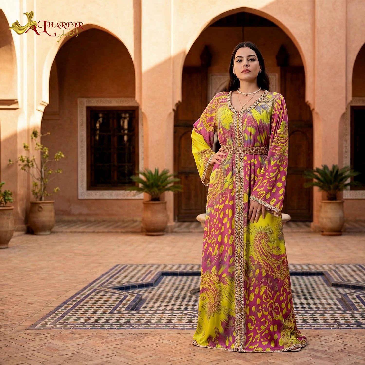 تصميم يجمع بين فخامة الستايل الخليجي ولمسة الفن المغربي الأصيل، بقماش حرير ناعم وانسيابي يعطيك إحساس بالترف من أول لبسة.